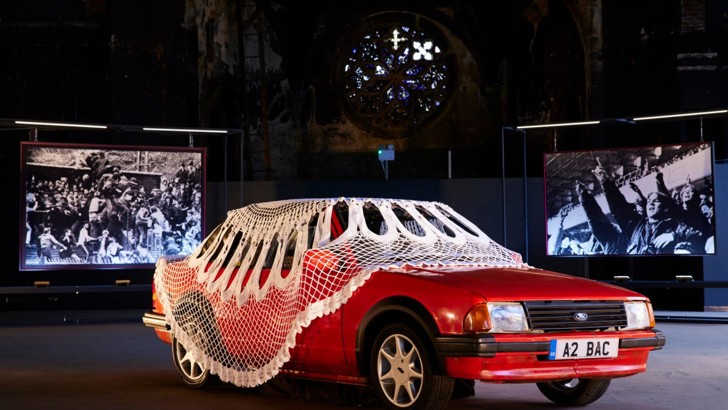 Image: Jasleen Kaur, Sociomobile, Red Ford Mk3 Escort Cabriolet XR3i, crocheted doily and sound, British Textile Biennial 2021
