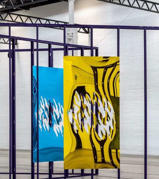 Viewers are invited to move through an immersive installation rendered in Syms’ signature purple – a reference to both to Alice Walker’s 1982 novel The Colour Purple and the special effects backdrops used in film and video. An exposed wall scaffold zig zags across the gallery creating multiple vantage points through which to encounter Syms’ ongoing episodic project SHE MAD (2015-present). A series of mirrored panels are cut to resemble ‘cookie’ filters - a device used to create lighting effects in film and theatre.
