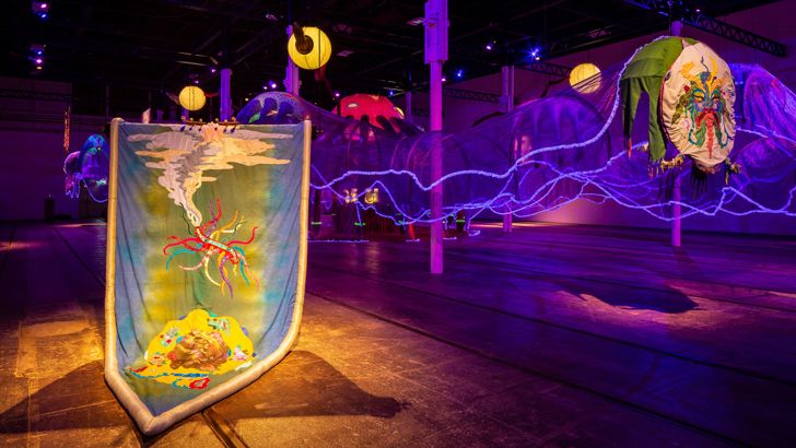 The exhibition includes an array of newly commissioned artworks in sculpture, textiles, printmaking, sound, light and moving image. These artworks are entangled in the architectural embrace of an immense, ethereal creature which stretches out across the gallery space, drawn from the artist’s own heritage and family mythology.