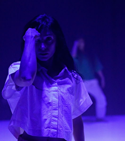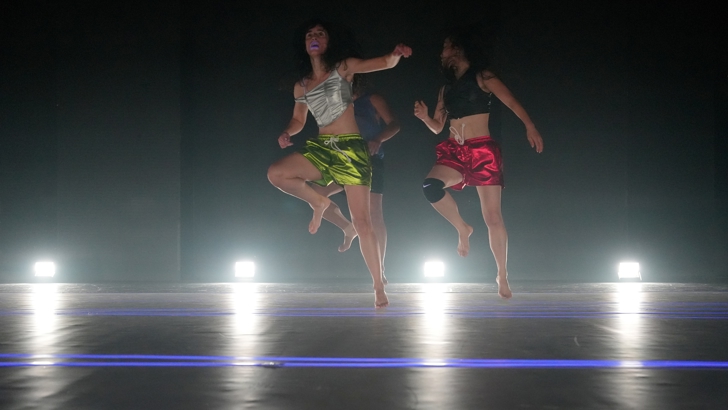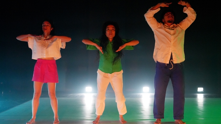 Performed on a stage, where the starkness of its raw form is highlighted with only designed lighting and club like sounds composed by musical duo Husk Husk filling the space, three dancers perform overly produced gestures, as they move between their independent selves, into a shared entanglement and back again, blurring the lines of their individual and collective identities.
