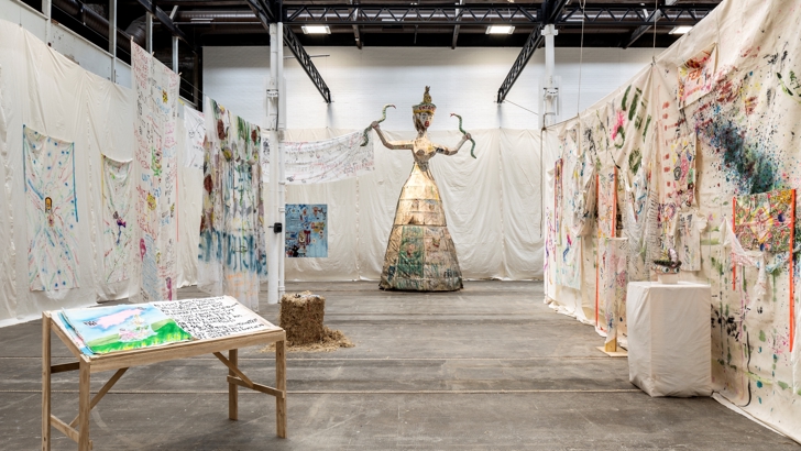 Tramway was previously the Glasgow site of To Gypsyland (2013), a travelling research project by Delaine and collaborator Barby Asante that explored Romani, Gypsy and Traveller presence in cities across the UK. In the intertwining of elements from past projects with new figures and narratives, Delainia reflects the ongoing address in the work of the mythologisation and demonisation of Romani, Gypsy and Traveller peoples in the UK and Europe. These concerns are amplified within present-day contexts of housing crisis, border control, forced displacement and environmental breakdown. Delaine’s work activates and reclaims space for new rituals and imaginaries of resistance against historical and contemporary environments of hostility.