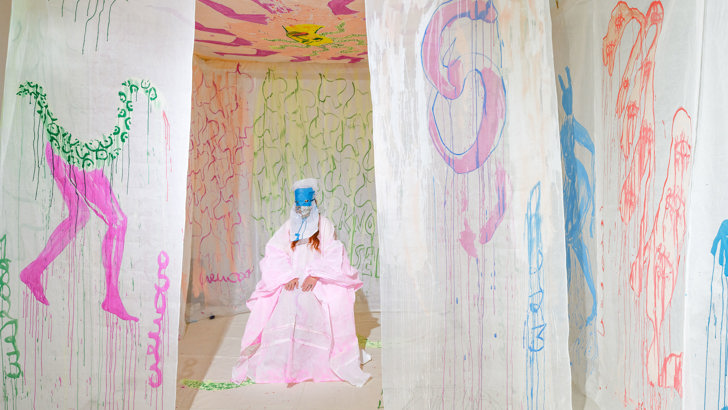 Tramway was previously the Glasgow site of To Gypsyland (2013), a travelling research project by Delaine and collaborator Barby Asante that explored Romani, Gypsy and Traveller presence in cities across the UK. In the intertwining of elements from past projects with new figures and narratives, Delainia reflects the ongoing address in the work of the mythologisation and demonisation of Romani, Gypsy and Traveller peoples in the UK and Europe. These concerns are amplified within present-day contexts of housing crisis, border control, forced displacement and environmental breakdown. Delaine’s work activates and reclaims space for new rituals and imaginaries of resistance against historical and contemporary environments of hostility.