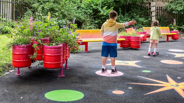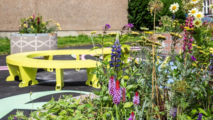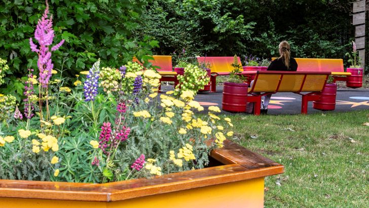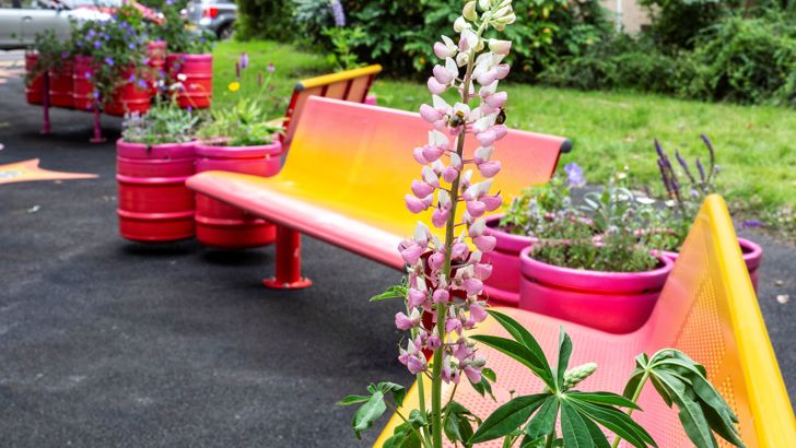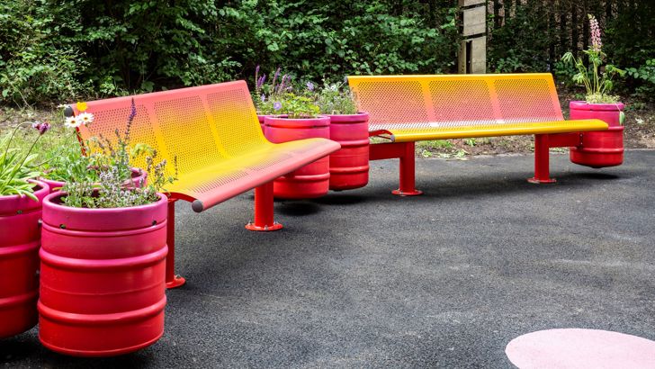 Commissioned to create a bespoke seating design for the park, Steff has recycled a series of former public benches in exuberant, joyful colours. The benches are connected by planters made from old beer kegs, re-purposed to create diverse habitats for plants, wildflowers and pollinating insects.