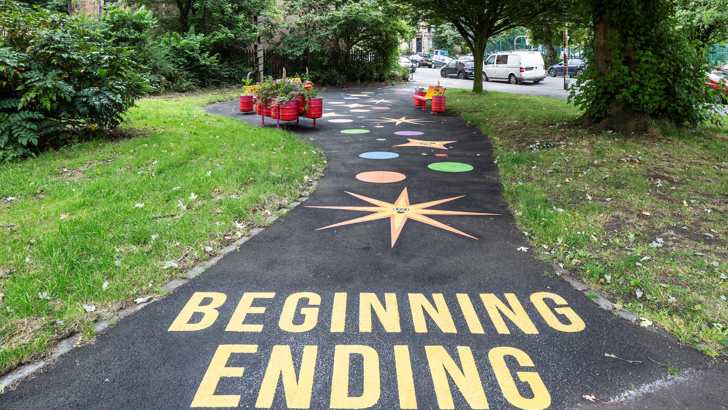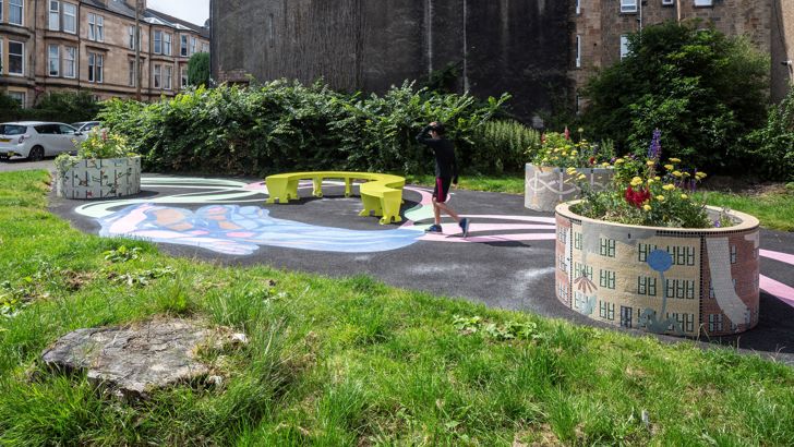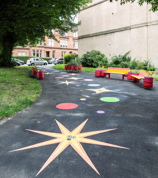 This project, part of our ongoing Beyond Walls strand, has brought permanent installations to two local park spaces close to Tramway: ‘Turtle Park’ on the corner of Leslie Street / Forth Street and ‘Stepping Stone Park’ on the corner of Leslie Street / Keir Street, both in Pollokshields.