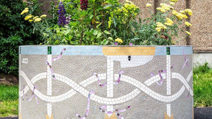 Southside-based artist Joanne Dawson has created a series of ceramic murals for three large scale planters. The designs centre around the themes ‘Prepare’, ‘Growth’, ‘Care’ and ‘Abundance’, tapping into the park’s function as both a community asset and a space for wildlife and insects.