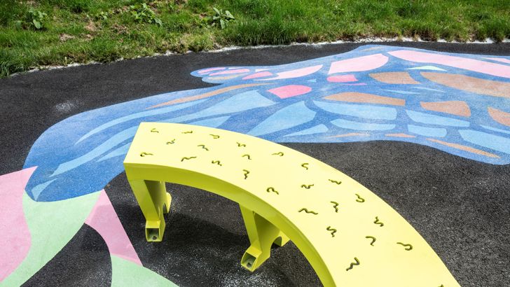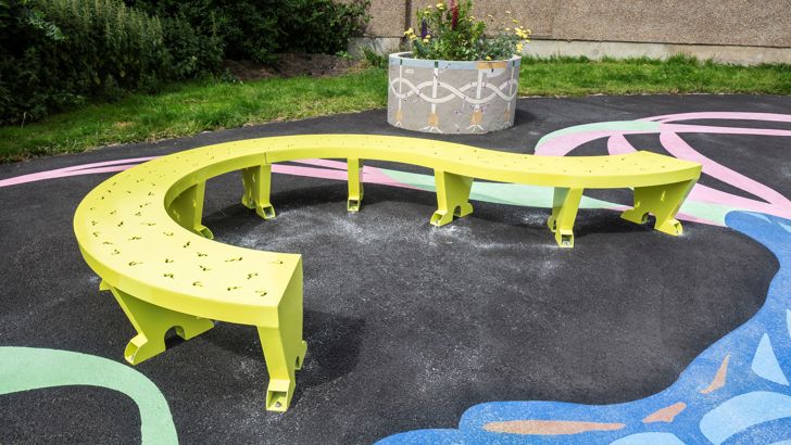 Nick has created seating that is both a sculpture and a park bench. Inspired by the insect inhabitants of our urban greenspaces, Nick has created a colourful, dynamic form that echoes the legs and body of a caterpillar, patterned with holes resembling wriggly worms.