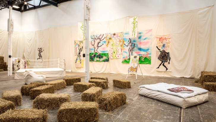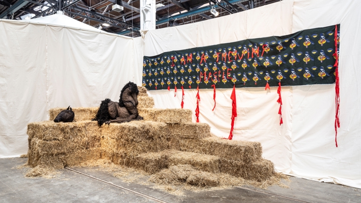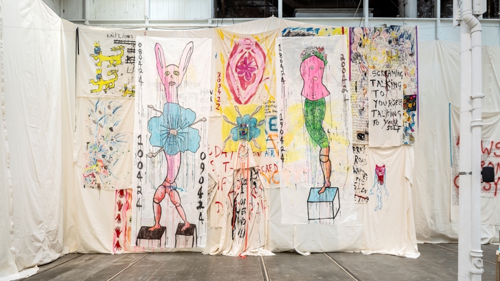 Tramway was previously the Glasgow site of To Gypsyland (2013), a travelling research project by Delaine and collaborator Barby Asante that explored Romani, Gypsy and Traveller presence in cities across the UK. In the intertwining of elements from past projects with new figures and narratives, Delainia reflects the ongoing address in the work of the mythologisation and demonisation of Romani, Gypsy and Traveller peoples in the UK and Europe. These concerns are amplified within present-day contexts of housing crisis, border control, forced displacement and environmental breakdown. Delaine’s work activates and reclaims space for new rituals and imaginaries of resistance against historical and contemporary environments of hostility.