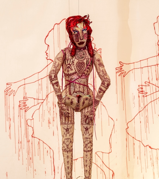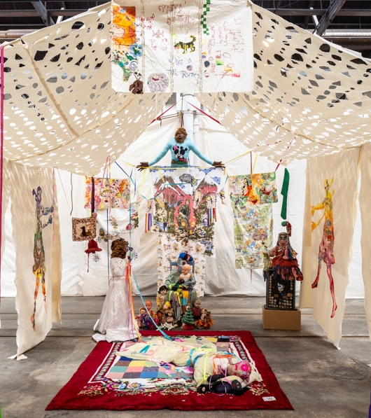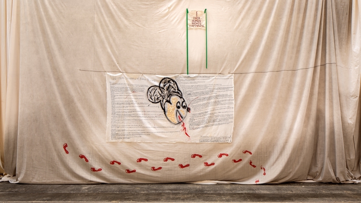 Delainia: 17071965 Unfolding is an exhibition of work by artist Delaine Le Bas (1965) presented within an expansive and layered installation. Delaine’s objects, environments, textiles, costumes and performances exist at the intersection of the personal and the political, aligning her experiences as a Romani person with perspectives on land, movement, gender, and discrimination.
