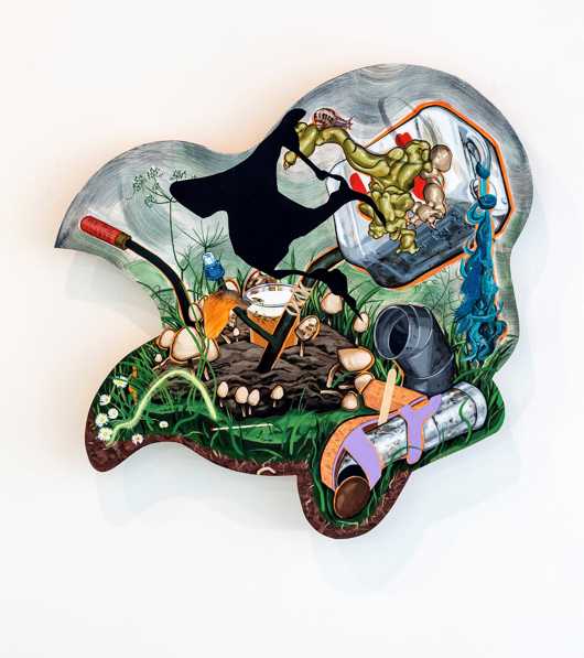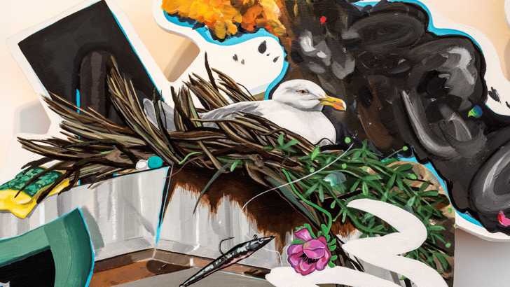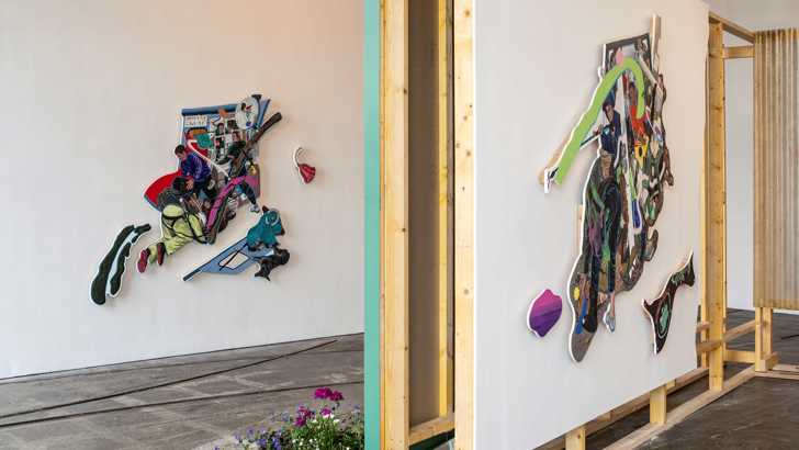 Flo Brooks’ practice encompasses painting, sculpture, collage, publishing and social engagement. The title of the show, Angletwich, takes its name from a Devonshire dialect term for a worm used in fishing bait, but has evolved to describe a fast moving creature or child. It speaks to the frenetic layering of people and activity within the works as well as recurrent motifs of migration and the makeshift.