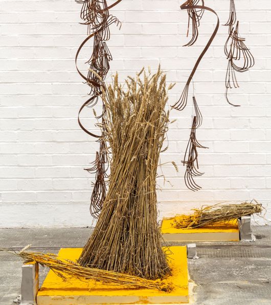 At Tramway Tarasewicz traces her own agricultural origins, creating a new body of work inspired by folk traditions and the circular relationships between protest, farm labour, dance, rhythm, and collectivity in rural communities. This expansive installation consists of fragments of retro agricultural machines that have fallen out of use, abandoned as the chain of modern production has shifted due to progressing ecological catastrophe or as with the current situation in Ukraine, War. Re-invigorated in the gallery, they form their own alternative community and culture, inspired by punk machinery, turbo whirls, folk practices, craft and the cyclical rhythms of rural labour.