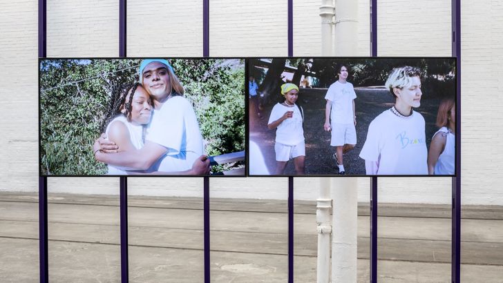 Shown on two monitors, S1:E1 A Pilot for a Show About Nowhere (2015) explores the formation of black subjectivities through American television. Appropriating footage from a range of sources such as The Bernie Mac Show and The Oprah Winfrey Show, the work explores how black sitcoms hold the potential to break down preconceptions, yet often erase the struggles and realities of the people they represent. Syms continues these themes in a newly commissioned episode S1:E4 (2020) presented on a large LED mesh screen. S1:E4 begins with a micro-aggression at a client’s party, triggering a flashback to the summer of 2000, when Martine was a camper at T-Zone, a week-long empowerment programme for teenage girls founded by a supermodel and business mogul.